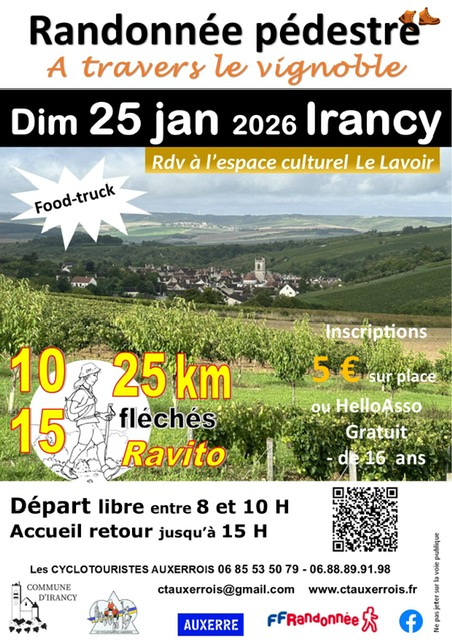 Le dimanche 25/01/2026, les cyclotouristes Auxerrois organisent une randonnée pédestre à travers le vignoble. Trois parcours de 10 – 15 et 25 Km sont proposés. RDV donc à l’Espace culturel Le Lavoir avec un départ libre entre 8h et 10h.